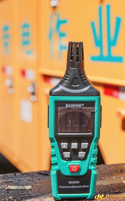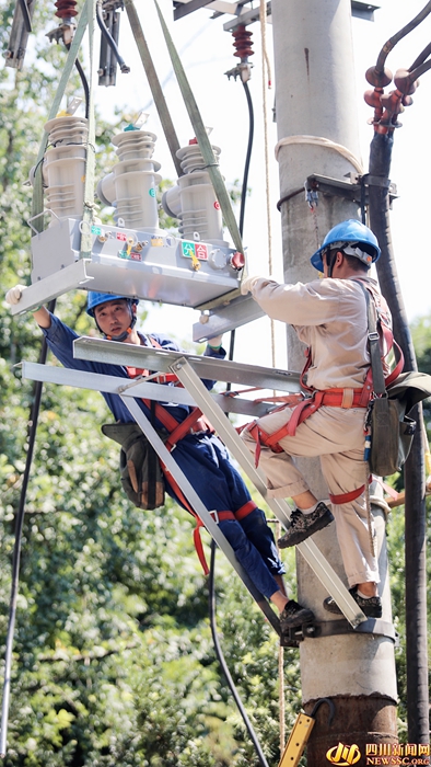 四川新闻网消息(记者 李举涛 摄影报道)8月3日正午,乐山市沙湾区铜河路北段,室外温度超过45摄氏度。国网乐山供电公司电力工人头顶烈日,登高作业,厚厚的衣服已被汗水浸透。