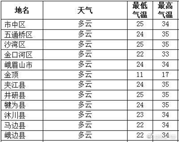 预计今天白天,乐山市市中区大佛街道、绿心街道、海棠街道、通江街道、全福街道、安谷镇、土主镇、剑峰镇、茅桥镇、牟子镇、棉竹镇、苏稽镇、水口镇、悦来镇和沙湾区嘉农镇、太平镇、沙湾镇、踏水镇、轸溪镇、葫芦镇、福禄镇、牛石镇、铜河街道最高气温将升至35℃以上,请注意防暑降温,适当减少户外活动。
