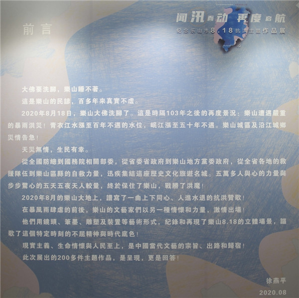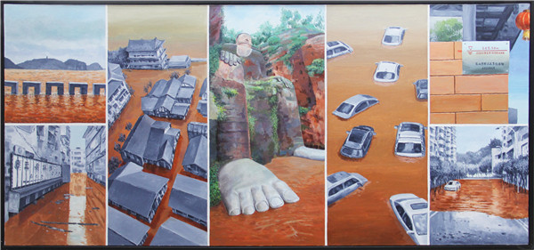 为了讴歌党员干部和人民群众抗击洪水的感人画面,乐山的文艺工作者们拿起自己手中的画笔、镜头,以艺术的形式讴歌众志成城的感人故事,用美术精品凝聚起人民群众抗击洪水的强大精神力量。