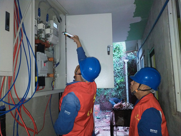 来到篦子街居民表箱,祝树全、李学勤依次检查了3个住户单元电能表运行情况。