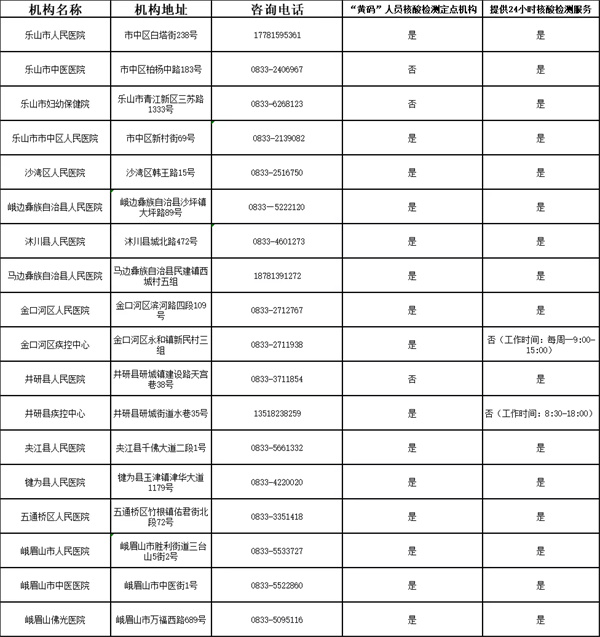 四川新闻网消息(记者 李举涛)针对近期多地发生新冠肺炎疫情的情况,为继续做好新冠肺炎疫情常态化防控工作,方便市民进行新冠肺炎核酸检测,乐山市卫健委近日对该市“黄码”人员核酸检测定点医疗机构、提供24小时新冠病毒核酸采样检测服务的医疗机构予以公示。