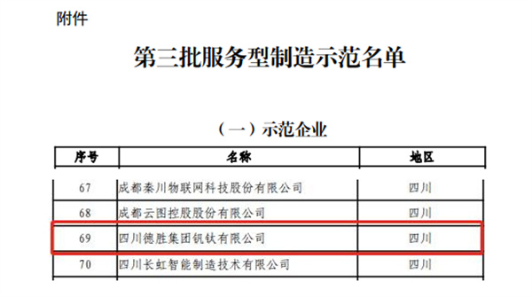 11月16日,工信部办公厅公布第三批入选服务型制造示范名单,位于沙湾区的四川德胜集团钒钛有限公司作为本批次四川4家、乐山唯一一家企业入选国家级服务型制造示范名单。据悉,这也是乐山企业首次上榜国家级服务型制造示范名单。