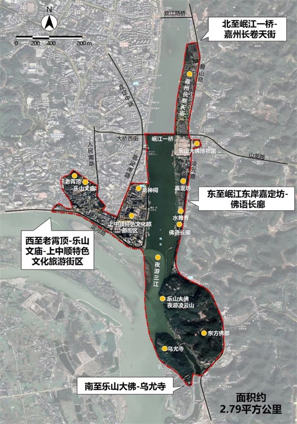据了解,烟火嘉州城位于乐山市中心城区,区域范围北至岷江一桥-嘉州长卷天街、南至乐山大佛-乌尤寺、东至岷江东岸嘉定坊-佛语长廊、西至老霄顶-乐山文庙-上中顺特色文化旅游街区,幅员面积2.79平方公里。