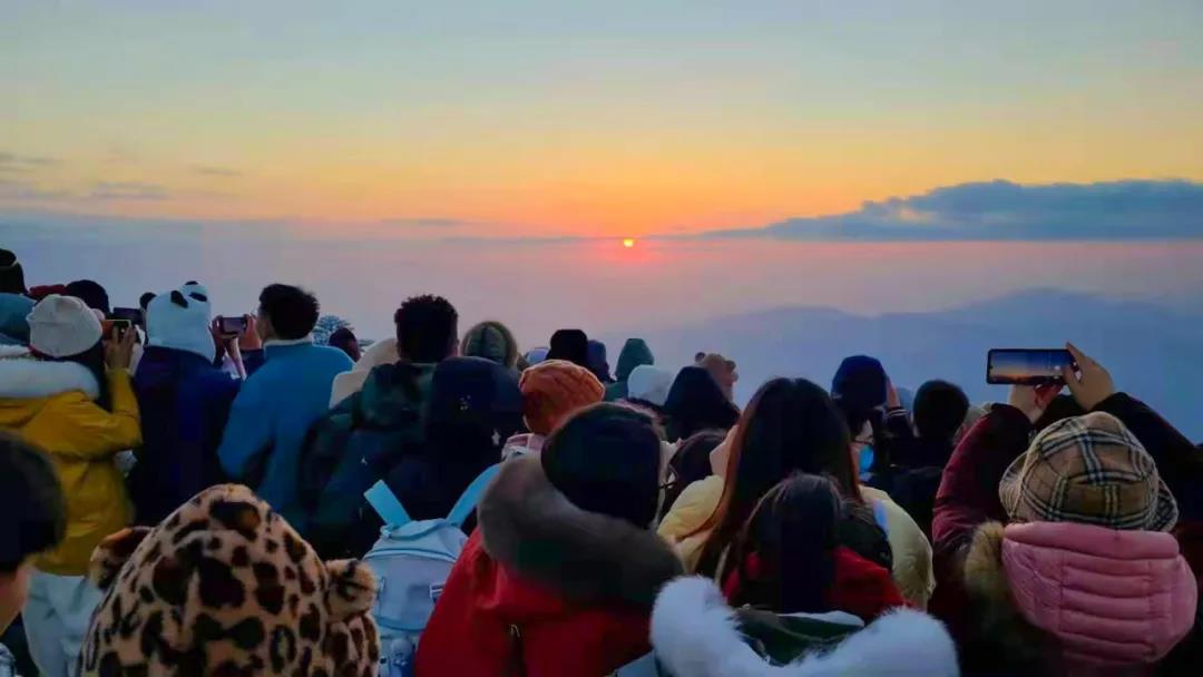 游客们沐浴着金顶祥光,惊喜不已,纷纷拍照留念,祈愿新年幸福安康。