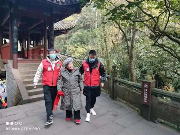 元旦当天,来自乐山市区的一位85岁高龄游客,时隔40年后再次来到峨眉山。景区工作人员将老人搀扶着往上走,终于重登清音阁。老人对心连心服务人员竖起大拇指。