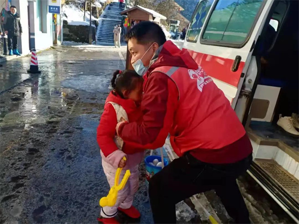 1月1日下午,一游客突发高原反应,金顶管理处“暖心服务车”将游客送至雷洞坪医务室后,工作人员肖丛伟帮助游客将同行小朋友抱下车进行照顾。