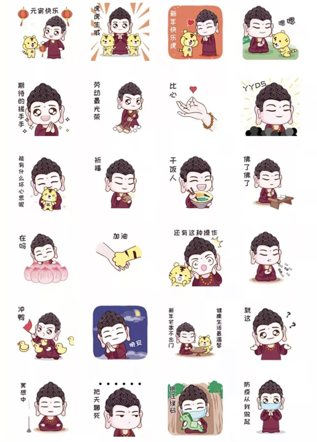 记者注意到,乐山大佛虎年新春微信表情包延续了以往超萌、佛系、可爱的风格,将现实中庄严的乐山大佛形象进行了“再塑造”。24个卡通动图,涵盖乐山大佛、虎年新春、网络流行语等元素,形象而生动。