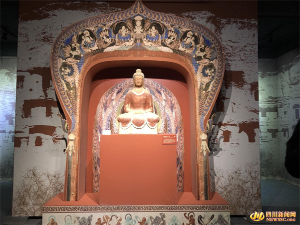 展览现场,人们不仅可以领略凿于北魏时期的禅定佛像那神秘的微笑、丝绸之路的沧桑岁月和悠久历史,也可以来到“普贤化现”展览区,探索敦煌壁画中与峨眉山的深厚渊源。峨眉山是普贤菩萨的道场,也是中国四大佛教圣地之一,榆林窟第3窟西夏时期的普贤变画面,被业界认为可能是对当时峨眉山的描绘。