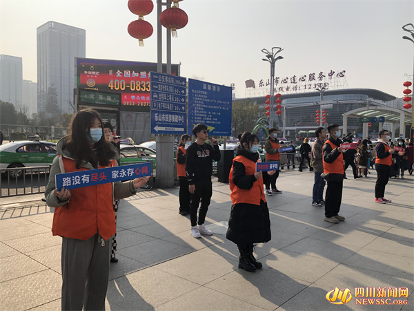 四川新闻网消息 (李薪 文/图)1月29日上午,乐山高铁站出站口洋溢着欢乐的节日气氛,团乐山市中区委、市中区文化体育和旅游局在这里共同举办了一场快闪和送福、送春联活动,让来乐的旅客和归乡的游子一下高铁就能感觉到扑面而来的暖意。