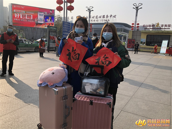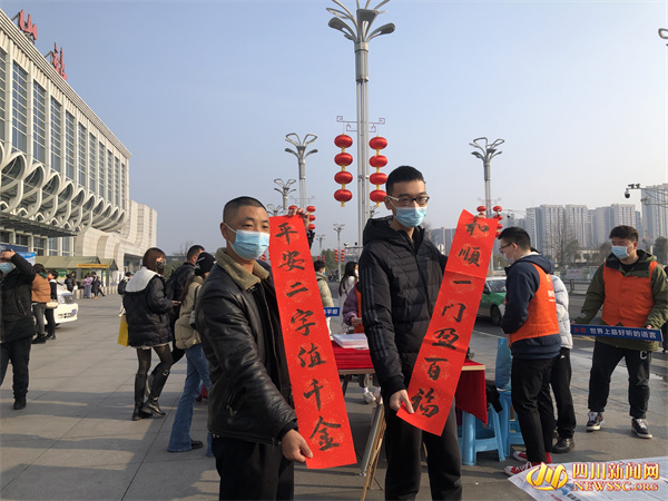 已经一年多没有回家看望父母的李女士拖着行李正准备赶往家乡金口河。“一出站我就体会到家的感觉,处处都是乡音乡情,很温暖。”“福字和春联我都领了,希望新的一年我们一家都有好运气。”