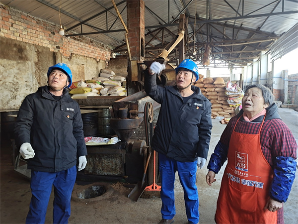 9点20分,在检查完线路、变压器后,蒋勇和同事走进商铺、麻辣烫店、小作坊,耐心细致向用户讲解安全用电知识,提醒广大客户在节日期间要注意用电安全,提高用电安全自我防护的能力,引导用户养成安全用电、节约用电、科学用电的习惯。“新年快乐!感谢你们帮助我们整改,我们一定提高安全用电意识,春节后马上对现有线路进行一次更换!”邓婆婆对党员服务队的服务十分满意。在杨柳榨油坊,服务队员检查了油坊线路设备,提出临时线路安全隐患整改方案,并帮助业主对开关、刀闸进行清污整理。“油坊是电气火灾易发场所,要高度重视安全用电、用火工作,马虎不得!”蒋勇说到。