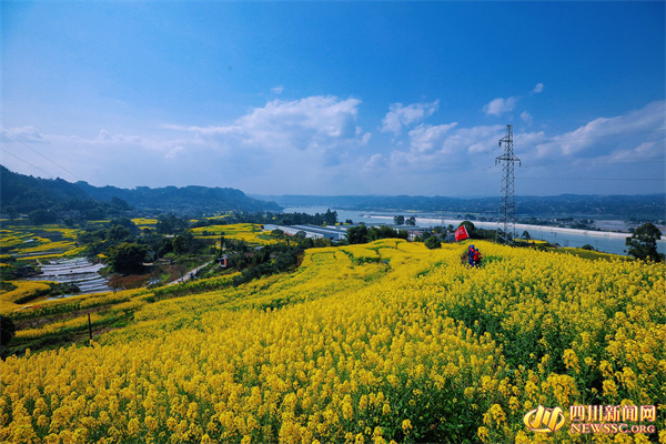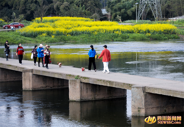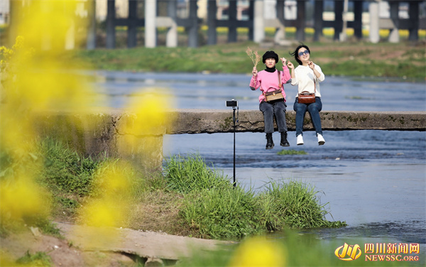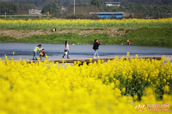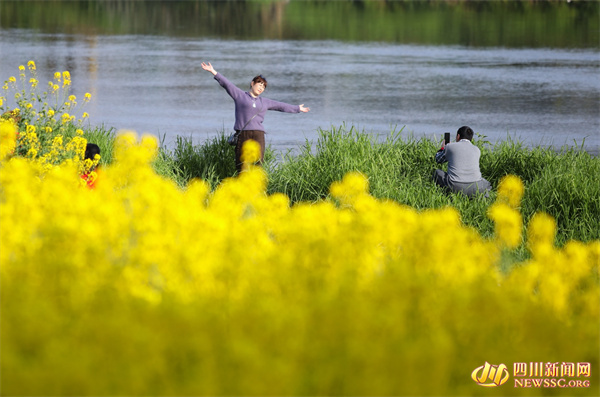 在乐山市市中区苏稽镇,峨眉河畔油菜花恣意绽放,春风拂过,散发出阵阵清香。慕名而来的市民游客漫步于河岸乡道,赏花拍照,尽享春日良辰美景。