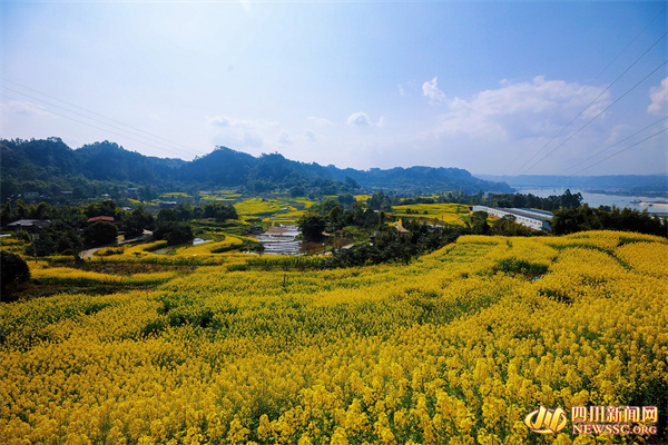 在五通桥区金粟镇,岷江两岸因怒放的油菜花,春意更浓。驻足花田间,低眉近看蝶舞蜂飞,举目远眺满眼金黄,好一幅绝美的乡村振兴田园画卷。
