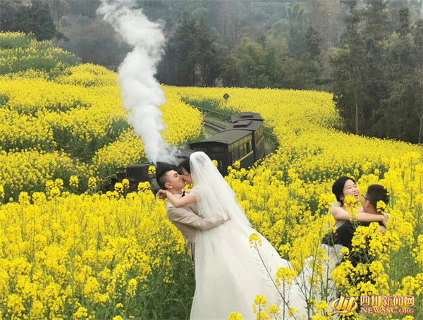 在春潮涌动的花海中,两对新人闻着甜甜的花香,携手徜徉,感受着春日的胜景。新娘身上轻盈的白纱和新郎的笑容在游客朋友和摄影爱好者的镜头里定格成一幅幅浪漫的图画。从蒸汽时代走来的小火车带着游客一起穿越了时空,也见证着新人们的幸福。