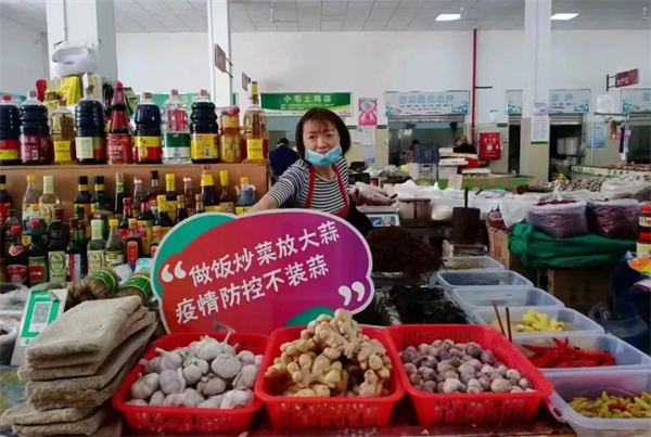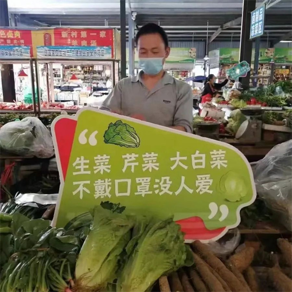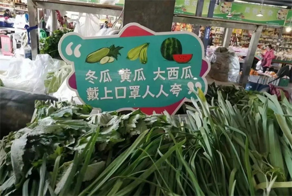 走进中心城区马铺农贸市场,以各种食材为主题的防疫标语牌竖立在各个摊位前的醒目位置,朗朗上口、幽默诙谐的顺口溜令人忍俊不禁,时刻提醒着大家做好个人防护。