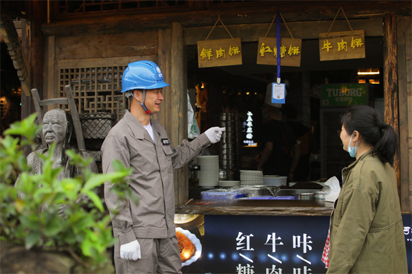 4月30日,时近中午,“五·一”假期的乐山苏稽古镇游人渐次增多,这些向美食慕名而来的大小游客穿梭在古镇的大街小巷。代德富和一同值班的张建明骑着“电马儿”到他们负责的沿河两岸商铺、老街、还有网红小吃店开展节日期间安全用电巡查。