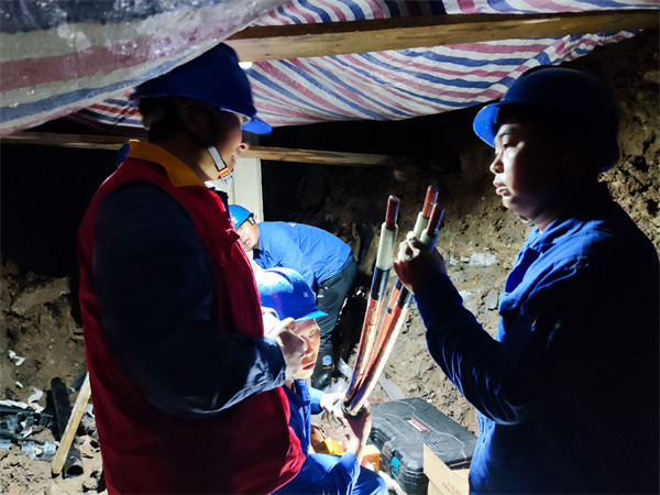 然而此时,现场却突降大雨,雨水不断顺在头盔滴在队员的脸上,增加了排查抢修难度。从中午到晚上,党员服务队队员一直坚守在现场,协同物业公司找到了故障点,制定了抢修方案,并一步步指导作业人员完成了电缆抢修工作。凌晨12点,在经历十几个小时的连续奋战后,峨眉华府小区终于恢复供电。看到电灯亮起,队员们脸上都露出成功的喜悦与安心的微笑。