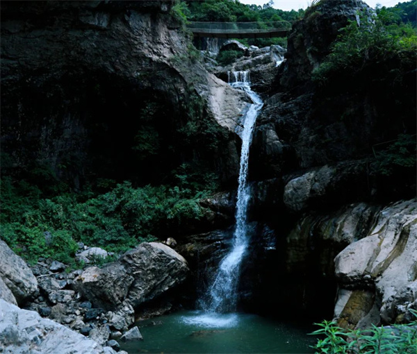 这里从上至下形成了七个大小不一形态各异的天然瀑布群,远远望去,青山巍巍飞瀑直下,水雾笼罩犹如一幅中国山水画。