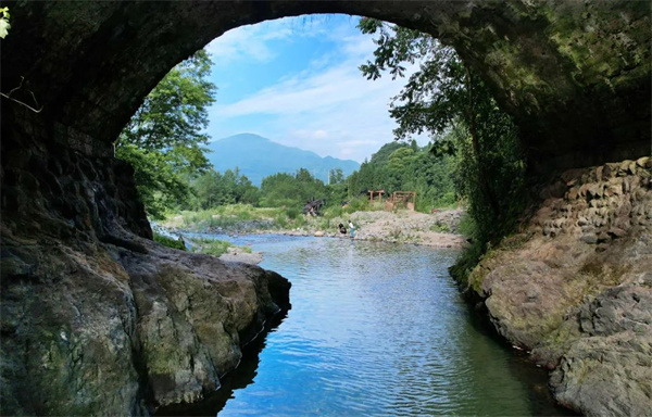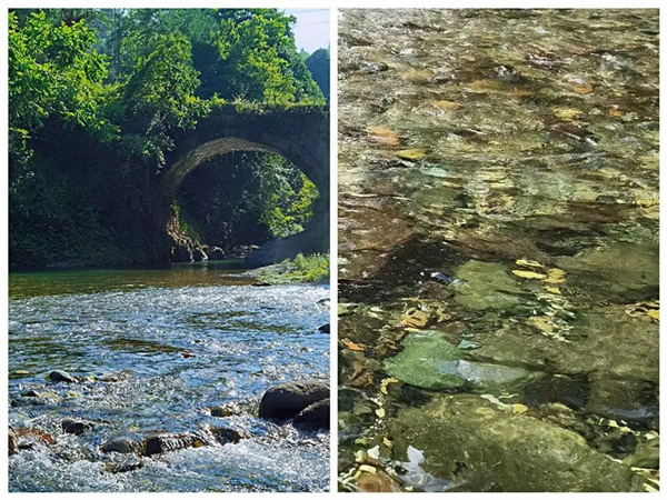 这里密林环绕彩蝶翩翩,叮咚的泉水经过一座古桥缓缓流出。果冻般透明的溪水,让人忍不住想亲密接触,一脚踏进溪流中凉意便传遍全身。