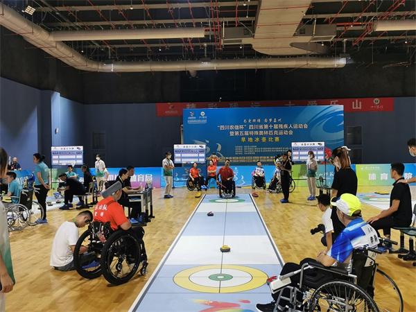 21日,“四川农信杯”四川省第十届残疾人运动会暨第五届特殊奥林匹克运动会旱地冰壶项目开赛。该项目共有32支队伍,154名运动员,分为听力组、智力组、轮椅组,将在为期3天的时间内,围绕6枚金牌展开激烈角逐。