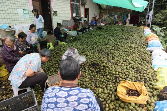 凌治平,金口河区金丰核桃种植专业合作社负责人,他正在组织工人对新采收的核桃进行脱壳处理。