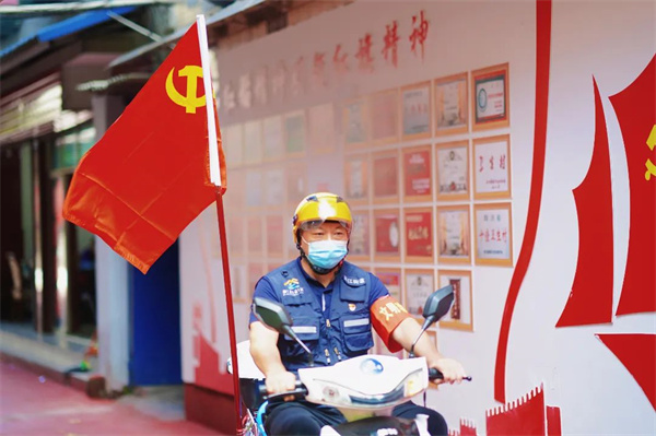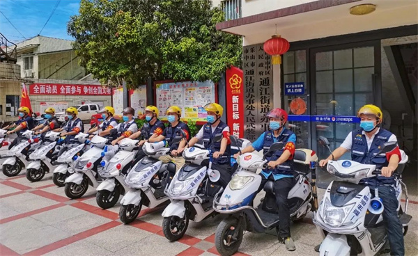 9月6日上午,在通江街道茶坊社区,网格员黄坤正和同事一起骑上电瓶车准备到老旧小区开展防疫宣传工作。