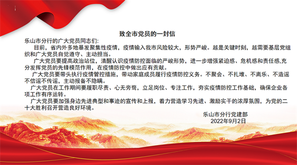 本轮成都疫情发生后,为充分发挥各级党组织战斗堡垒作用和党员先锋模范作用,市分行党委于9月2日发出《致全市党员的一封信》,号召全市党员增强大局意识,履行疫情防控义务,共同努力,齐心战“疫”。全市各党支部组织辖内党员积极响应、主动担当,迎难而上,通过多种形式积极投身到疫情防控工作中,为当地疫情防控工作贡献力量。