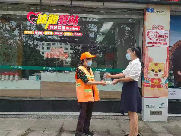 沐川县支行党支部依托与县总工会牵头成立的党建联盟“沐源驿站”,充分发挥其服务地方百姓的公益属性,为环卫工人、快递小哥等户外劳动者免费提供口罩、消毒液等防疫物资,为他们户外劳作提供基本防护保障,积极践行国有大行社会责任。