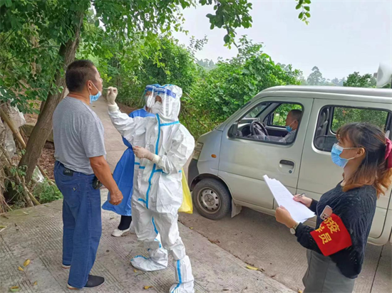9月2日,井研县石泉村第一书记张恒通过前期摸排了解到,村里还有几名成都返乡人员未进行核酸检测,又无法外出,十分为难,他赓即向镇党委汇报协调车辆和核酸检测人员,并带队前往返乡人员家中进行核酸检测。事后,石泉村4组村民崔大爷说:“我们从成都新都区回来,下高速做了核酸,剩下几次还不知晓得咋个做,感谢张书记带医护人员专程到我家(做核酸),太感谢啦!”。