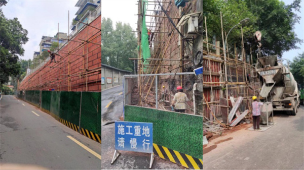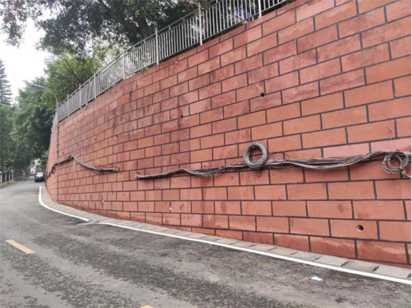 尖子山巷处边坡堡坎长约140米,最高约9米,始建于2000年左右。近年来,该处条石风化严重,受暴雨等叠加影响,局部出现变形,裂缝不断加剧,存在坍塌迹象。针对这一情况,工程公司立即组织相关单位现场勘探,与技术部门密切交流,结合区域地质和周边环境情况,制定了采取钢筋混凝土挡墙及锚杆加格构梁结合的支护治理方案,通过板肋式挡墙加固、设置盖板式截排水沟、增设被动防护网等措施,对尖子山巷堡坎进行应急加固。