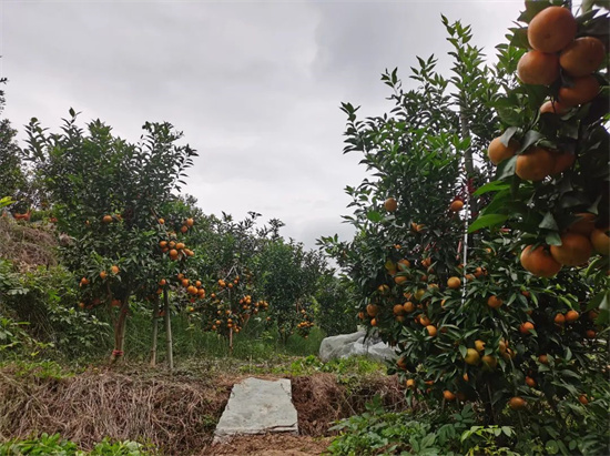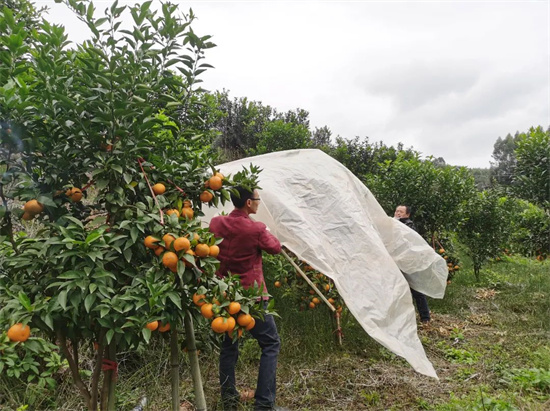 近日,土主镇桐花塘村,连片的柑橘树上挂着沉甸甸的果实,村民阚建平正在地里忙着给柑橘树盖膜:“给它们盖上膜可以起到保温作用,让柑橘树顺利过冬,在明年四月卖上一个好价钱。”阚建平说,他以前在外务工,但看着家乡公路修好了,基础设施也逐渐完善,家里还有一片土地,适宜种植柑橘,便决定回村搞发展。目前,阚建平种植的柑橘树约有四千多棵,占地三十余亩,2016年到现在已经发展了五六年的时间了,产量每年大约是四五万斤,总产值近十万元。