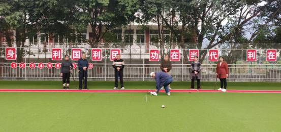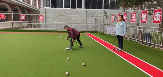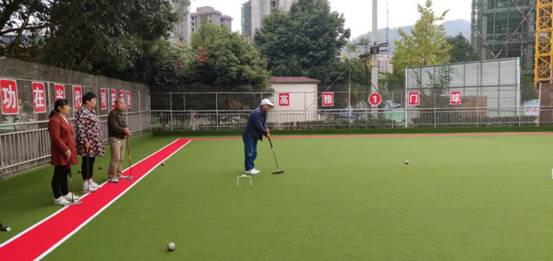 走进已投用的门球场,绿底红白框的左右两个门球场格外耀眼,显得高雅而且很有档次;围栏上“没有全民健康,就没有全面小康”“全民健身 利国利民 功在当代 利在千秋”“我运动 我健康 我快乐”等红底白字标语格外显目,向人们诠释着全民健身的重要性;老年朋友们正兴高采烈地举行着门球友谊赛,展示着自己的球技和风采。