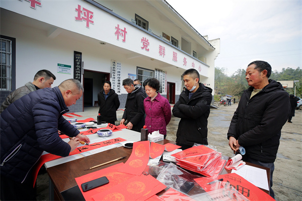 四川新闻网消息 近日,乐山市政协秘书长、市政协机关党组书记廖敏率市政协秘书长班子和市政协书画院部分书法家,到对口联系的沐川县杨村乡碑坪村送精神、送文化、送温暖。