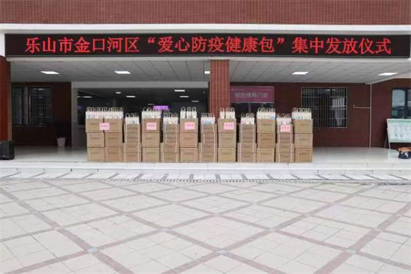 发放仪式现场,金口河区领导付爱龙、任登莲将一份份暖意浓浓的“爱心防疫健康包”送到群众代表和各乡镇代表手中。