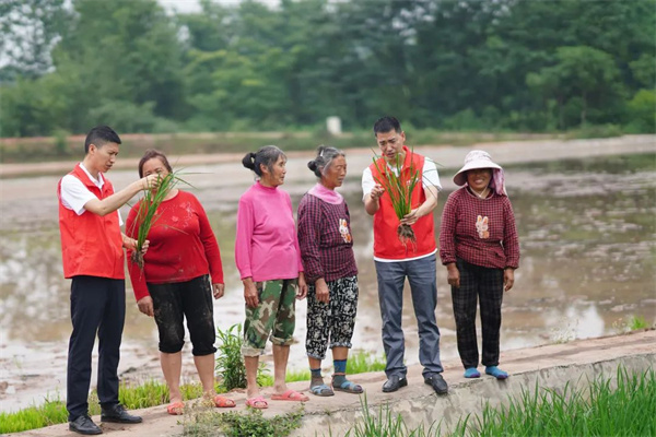 农技专家在田间为村民讲解水稻病虫害防治知识