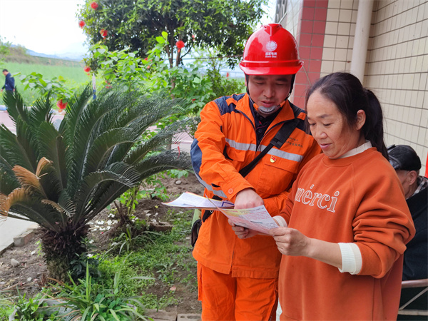 在盐溪口村电力便民服务示范点,电力网格员古建和电力联络员杨荣向村社群众现场宣讲办电政策、线上缴费形式及丰枯、丰谷避峰用电、电价电费政策以及供电所故障报修电话。