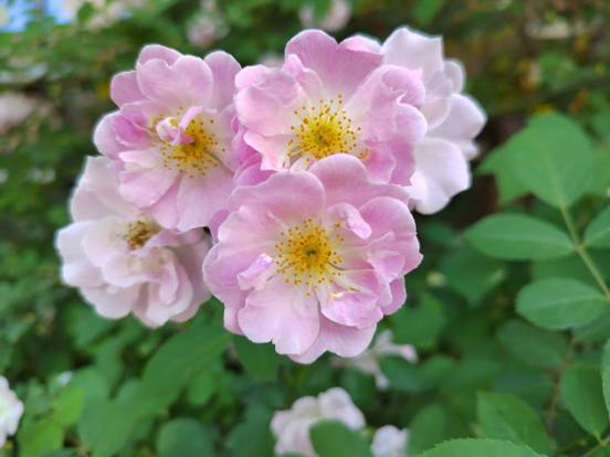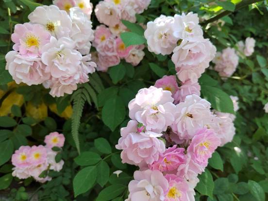 风和日丽的天气,一簇簇、一丛丛的蔷薇花,在绿叶的衬托下,姿态万千,随风摇晃,芳香诱人。“嗡嗡”的蜜蜂飞来飞去,不时停在花蕊尽情采蜜。美景令人陶醉,游客流连忘返。