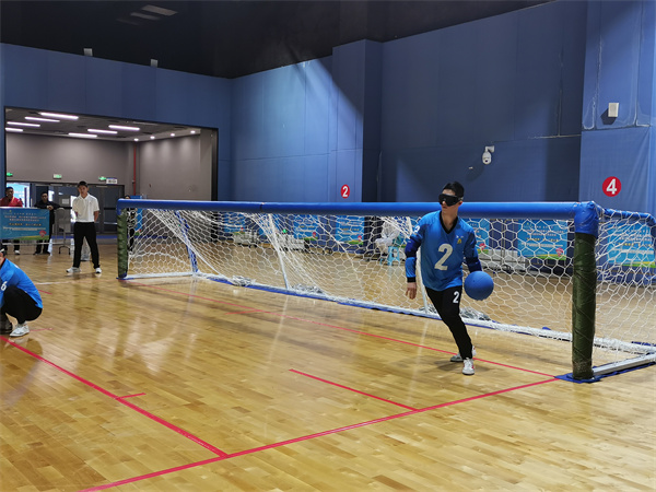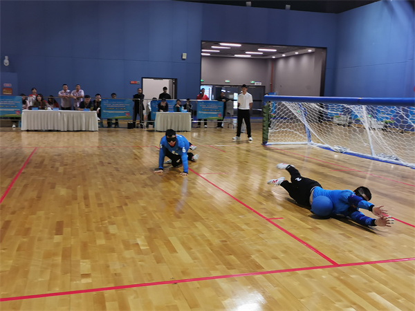 “保持安静,投球!”——随着裁判的一声令下,上午9时男子组夺冠赛打响。双方各三名队员头戴眼罩,做好战斗进攻和防守姿势,全力投球、听声辨位、奋力阻挡……整场比赛紧张而刺激,观赏性十足。比赛开赛不久,乐山队便率先攻破对方大门,1比0取得良好开局。随后,乐山队越战越勇,接连进球,上半场以7比1的大比分保持领先。下半场,虽然宜宾队表现得更加顽强,但乐山队的攻势也更加猛烈,防守更是无懈可击,最终以11比1结束全场比赛。