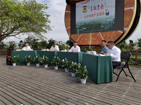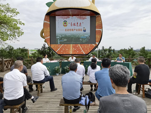 在百里产业环线橘天台,参加人员有序就座。汪革显、曾德权委员和郭俊华委员分别就国家级现代农业示范区的创建要求、井研柑橘发展的现状和未来发展方向;种植高品质柑橘的生产管理;柑橘新品种推荐和如何提升柑橘品牌价值三方面的内容进行了精彩的交流分享。
