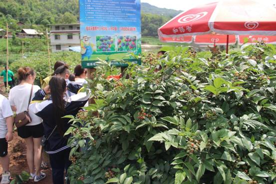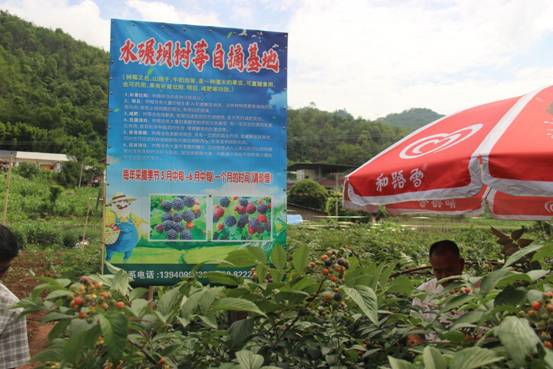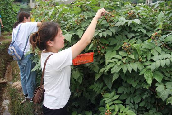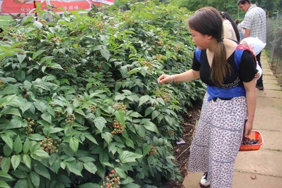 树莓园的老板游志玖曾在外省打工19年,2021年回到家乡创业。考虑到树莓具有补肾壮阳、固精、美容养颜、抗菌消炎、活血化瘀、除烦止渴等功效,效益高,本地鲜有人种,同时考虑到当地地处县城郊区,有公交车直达,便于市民休闲游玩,于是在不影响粮食生产的前提下,采取间种的方式,从广西引进树莓种植,建起家庭农场,开始着手打造乡村休闲旅游基地。旨在带动村民共同增收,促进乡村振兴。第一期试种的数亩经过两年的培育,于今年5月20日开园开始接待游客体验采摘、休闲游玩。笔者看到,黑珍珠似的树莓泡儿相挨着,一团团、一簇簇挂在枝头,在明媚阳光照耀下闪闪发亮,令人垂涎欲滴。由于事先游老板通过抖音、快手、微信、QQ等社交媒体对树莓园作了充分的宣传,致使开园后游客络绎不绝,沐川、犍为等邻县的游客也闻讯赶来。来自沐川县利店镇的游客李先生兴奋地说,感觉这是一个新奇种植项目,高速公路方便,就带着家属过来耍,实地考察一下,能否引到家乡种植。