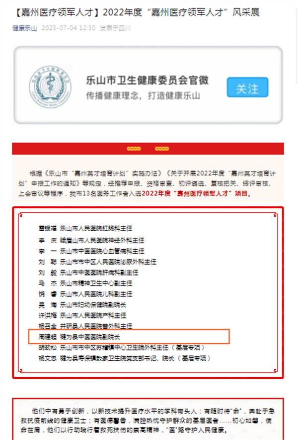 四川新闻网消息 根据《乐山市“嘉州英才培育计划”实施办法》《关于开展2022年度“嘉州英才培育计划”申报工作的通知》等规定,经推荐申报、资格审查、初评遴选、复核把关、终评审核、上会审议等程序,犍为县中医医院周建超入选2022年度“嘉州医疗领军人才”项目。