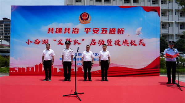 仪式期间, 区公安分局和中国电信乐山分公司签订了五通桥区“小西湖义警”战略合作协议, 石柱华向中国电信五通桥区总经理陈闻授予“小西湖义警队”旗帜, 陈闻带领义警代表庄严宣誓。