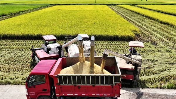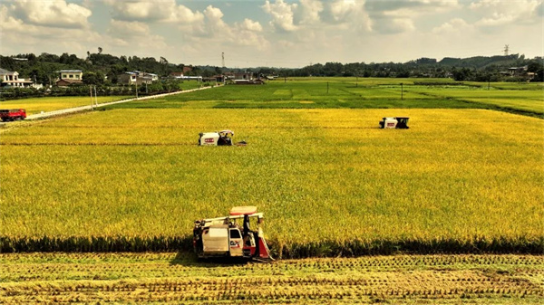 在夹江县新场镇的海滨农场,一片高标准农田种植的水稻迎来丰收,颗粒饱满的稻穗将稻秆压弯了腰。稻田里,多台收割机正开足马力,在田间忙碌作业,割稻、脱粒、装车,一气呵成,约15分钟,便可完成一亩稻田的收割。