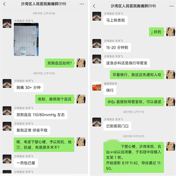 8月19日上午11点左右,在乐山市人民医院-沙湾区人民医院胸痛群内,突然传来一张患者的心电图,乐山市人民医院心内科住院总医师谭志强查看后,迅速与该院急诊科出诊医生沟通患者的情况,并建议绕行救治流程。