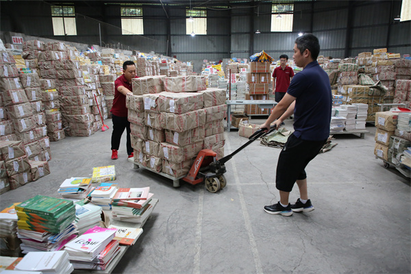 新华文轩马边分公司工作人员在教材仓库内清点整理和搬运新学期教材。