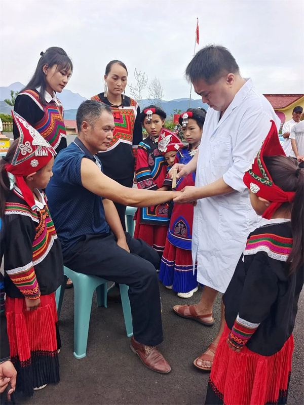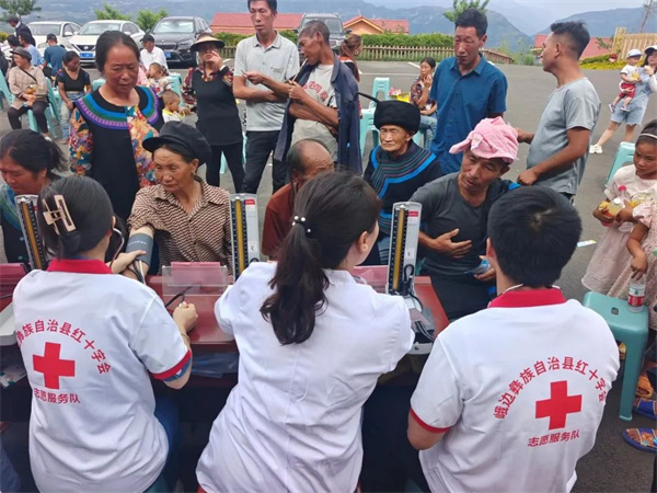 培训义诊现场,专家、教授、老师和志愿者通过彝、汉双语开展应急救护教学操作、义诊活动,详细为彝族群众讲解了红十字救护概念及心肺复苏、创伤救护(外出血)应急救护理论知识,现场演示心肺复苏和包扎、骨折固定实际操作。乐山市职业技术学院临床医学院专家教授为前来咨询的彝族群众答疑释惑,详细回答大家提出的各类健康问题,免费为彝族群众提供内科、口腔常规检查及儿童、老年人健康咨询等健康诊疗服务,部分志愿者分组开展走访入户问卷调查。