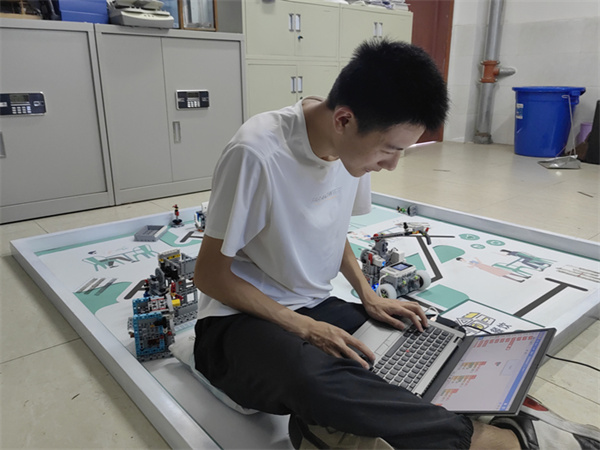 “只有结构和程序完美结合,机器人才能发挥最佳状态,赢得高分。”赛前,整个团队利用课余时间对机器人结构进行优化,机器人是拆了装,装了拆,经过反复DIY才最终成型。接下来,就是根据任务设计相应的程序,而智能餐饮机器人项目中难点就是精准配餐,要通过抓臂和气泵让相应颜色纸片精确放到指定餐盒中并送餐,这是最难得分点也是最易失分点。训练时,大家挖空脑洞为机器设计动作,卡壳是家常便饭,好在团队没有放弃硬是咬紧牙关挺了过来,最终攻克了所有任务的技术难关。