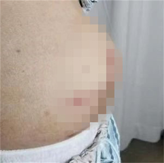 患者李婆婆(化姓),因在30年前做了下腹部大型手术,中下腹留下长约20cm手术瘢痕。约2个月前,李婆婆中下腹出现大小约20cm*15cm的包块,在她平躺或按压的时候包肠还能“消失”,但是,在她咳嗽或行走的时候包肠又会凸现出来,且经常出现胀痛,需要经常用手对其按压“复位”,非常影响正常生活。