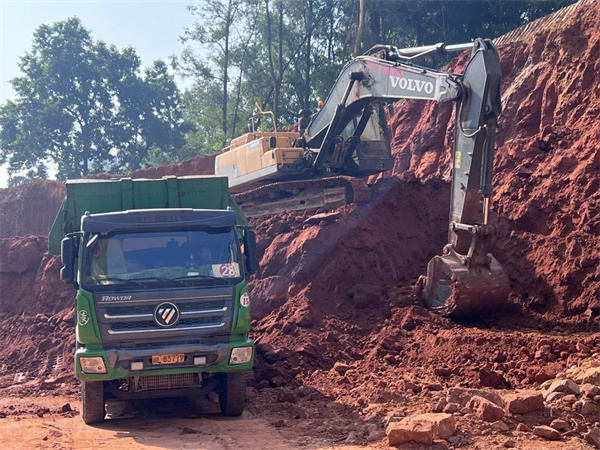 项目现场,大型挖掘机正伸出长长的“手臂”开挖土石方,并不时将土石方清运到山下整齐停放的一辆辆大型货车上。