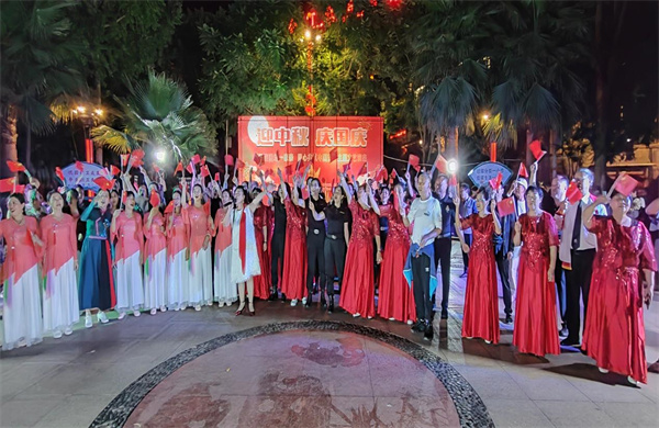 “……五星红旗迎风飘扬,胜利歌声多么响亮,歌唱我们亲爱的祖国,从今走向繁荣富强。歌唱我们亲爱的祖国,从今走向繁荣富强。”一首由全体演职人员挥舞着国旗齐唱的《歌唱祖国》将晚会推向高潮。